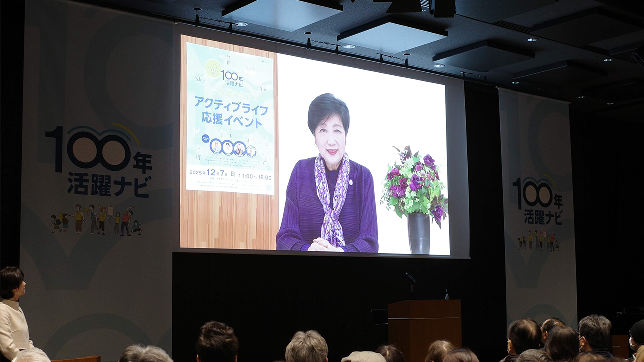 会場内は大きく分けて、講演会が行われるホールエリアと、体験コーナーや展示ブースが並ぶスペースで構成。講演会では、落合博満さん、中井美穂さん、假屋崎省吾さんといった各界の著名人を招き、御自身の経験を踏まえて、シニア・プレシニア世代が生きがいをもって暮らすためのヒントについてお話いただいたほか、東京都健康長寿医療センター研究所副所長の藤原佳典藤原さんからは、社会とのつながりや役割を持つことが、フレイル予防につながるというお話がありました。会場内では、健康チェックや各種体験プログラム、社会参加に関わる団体の展示などを行い、参加者が回遊しながら楽しめるスタイルで実施されました。講演に先立ち上映された小池百合子知事のビデオメッセージでは、「アクティブ長寿社会に向けて一緒に大きな一歩を踏み出しましょう」という呼びかけがありました。
